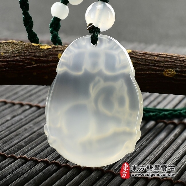 這一只吊墜是屬於「瑪瑙」的材質。「瑪瑙」是矽氧礦物,是石英礦,硬度在莫氏7級以上,表面呈次玻璃光澤,表面光亮度好。其顏色自然純正、細潤、紋理自然流暢,廣受大家的喜愛。瑪瑙也是佛教七寶之一,象徵友善的愛心和希望,自古以來一直被當為辟邪、護身符使用,配戴瑪瑙的吊墜,可以增強質樸和親切的力量,同時對於增加自信都會有正面的幫助。