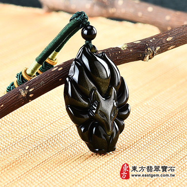 商品名稱:金曜石九尾狐狸項鍊玉珮(九尾狐狸、招財、人緣、桃花,狐仙:九尾狐狸牌金曜石九尾狐狸玉珮、金曜石九尾狐狸玉墜)。金曜石九尾狐狸,FX057。客製化訂做各種金曜石狐狸吊墜玉珮項鍊。★附東方翡翠寶石保證卡