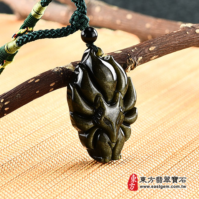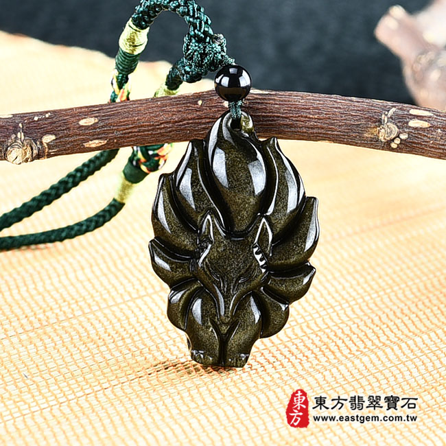 商品名稱:金曜石九尾狐狸項鍊玉珮(九尾狐狸、招財、人緣、桃花,狐仙:九尾狐狸牌金曜石九尾狐狸玉珮、金曜石九尾狐狸玉墜)。金曜石九尾狐狸,FX058。客製化訂做各種金曜石狐狸吊墜玉珮項鍊。★附東方翡翠寶石保證卡