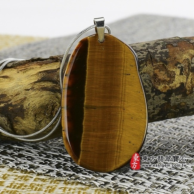 這一款吊墜是「黃虎眼石」的材質,屬於半寶石、又稱虎睛石,表面具有絹絲光澤、質地堅硬,顏色多樣化有黑色、黃色、金褐色條紋相間,紋路多樣化,各有特色。黃虎眼石色澤明亮動人,散發出有如太陽般的光輝,象徵著照亮黑暗的智慧之光,黃色在東方有著「尊貴、優雅」的涵義,為帝王的御用顏色,祝福人們如帝王般大權在握、家財萬貫。從古至今,流傳著虎眼石有著辟邪招財的功效,男士配戴虎眼石,祝福他們事業蒸蒸日上。女士配戴期許她們堅定心志、獨立自主。
