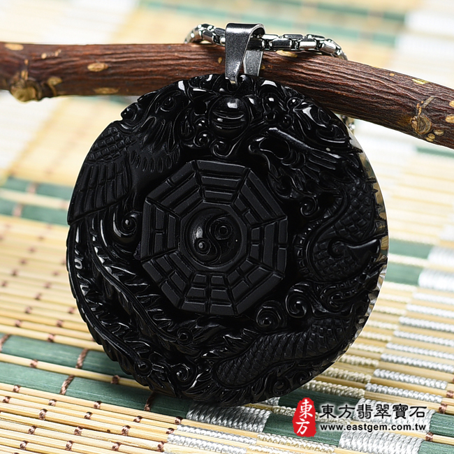 商品名稱:黑曜石龍鳳八卦項鍊玉珮(龍鳳呈祥:龍鳳八卦牌黑曜石龍鳳八卦玉珮、黑曜石龍鳳八卦玉墜、龍十二生肖項鍊)。全黑黑曜石龍鳳八卦,DR523。客製化訂做各種黑曜石龍鳳八卦吊墜玉珮項鍊。★附東方翡翠寶石保證卡