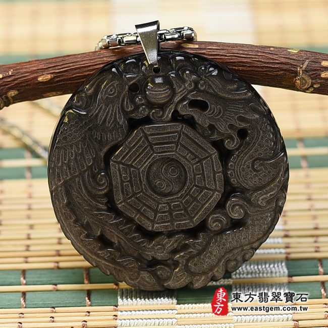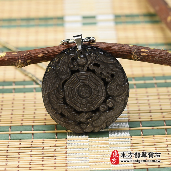 商品名稱:銀曜石龍鳳八卦項鍊玉珮(龍鳳呈祥:龍鳳八卦牌銀曜石龍鳳八卦玉珮、銀曜石龍鳳八卦玉墜、龍十二生肖項鍊)。銀曜石龍鳳八卦,DR530。客製化訂做各種銀曜石龍鳳八卦吊墜玉珮項鍊。★附東方翡翠寶石保證卡