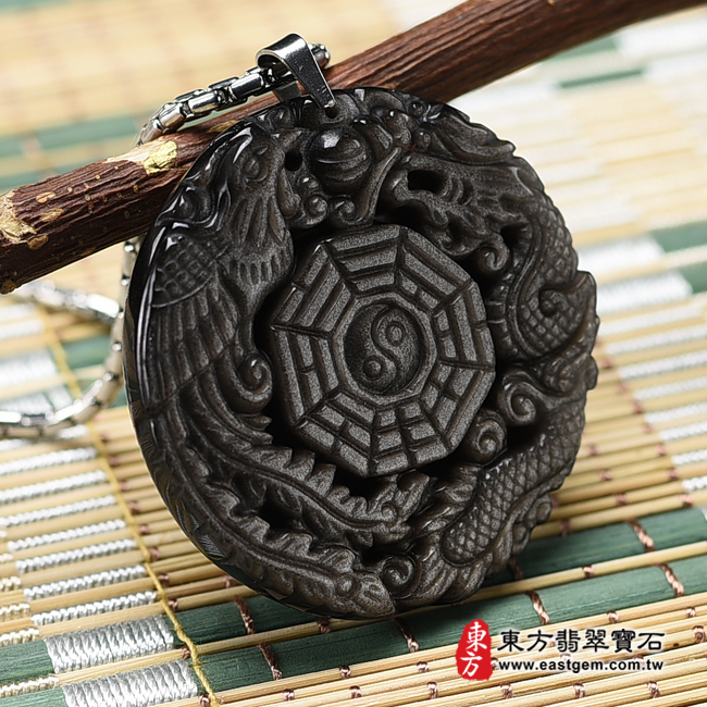 商品名稱:銀曜石龍鳳八卦項鍊玉珮(龍鳳呈祥:龍鳳八卦牌銀曜石龍鳳八卦玉珮、銀曜石龍鳳八卦玉墜、龍十二生肖項鍊)。銀曜石龍鳳八卦,DR534。客製化訂做各種銀曜石龍鳳八卦吊墜玉珮項鍊。★附東方翡翠寶石保證卡