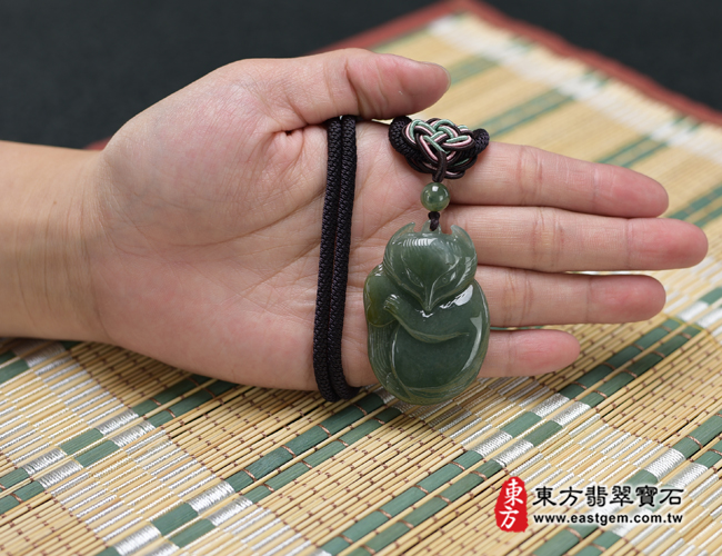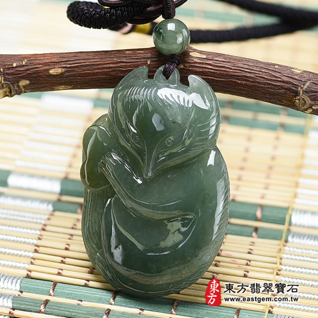 商品名稱:翡翠狐狸項鍊玉珮(狐狸:狐狸牌A貨翡翠狐狸玉珮、緬甸玉狐狸玉墜)。油青種狐狸,FX060。客製化訂做各種翡翠狐狸吊墜玉珮項鍊。★附A貨翡翠雙證書