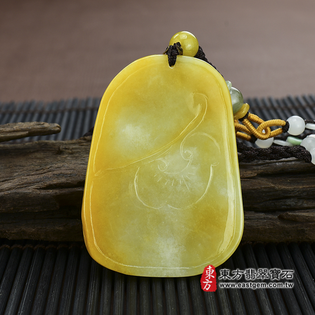 此吊墜表面光澤呈油脂光澤,在翡翠分級裡面,屬於「黃翡」的種地。它的顏色是硬玉晶體生成後,由鐵元素致色而形成。黃翡在歷史上代表平安,黃色代表招財,是具有富貴色彩的翡翠品種。