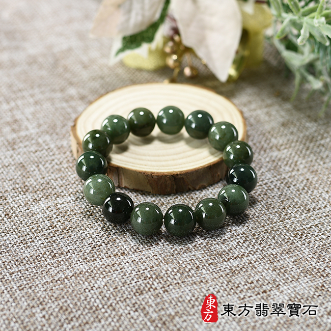 商品名稱:碧玉手珠(碧玉手珠、和田玉手珠、深綠色,珠徑約13.4mm,15顆珠,ORA048)。客製化訂做各種碧玉手珠,和田玉手珠。★附東方翡翠寶石證書