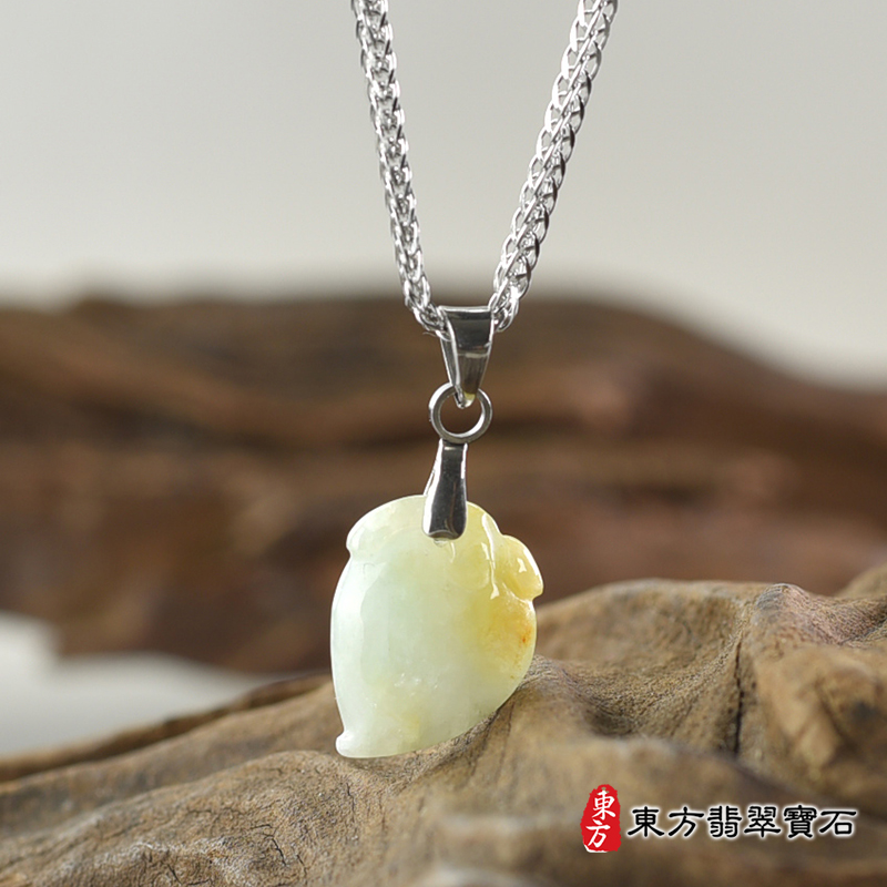 商品名稱:翡翠壽桃項鍊玉珮(福壽雙全:壽桃牌A貨翡翠壽桃玉珮、緬甸玉壽桃玉墜)。淺綠帶黃色糯豆種壽桃,FW205。客製化訂做各種翡翠壽桃吊墜玉珮項鍊。★附A貨翡翠雙證書