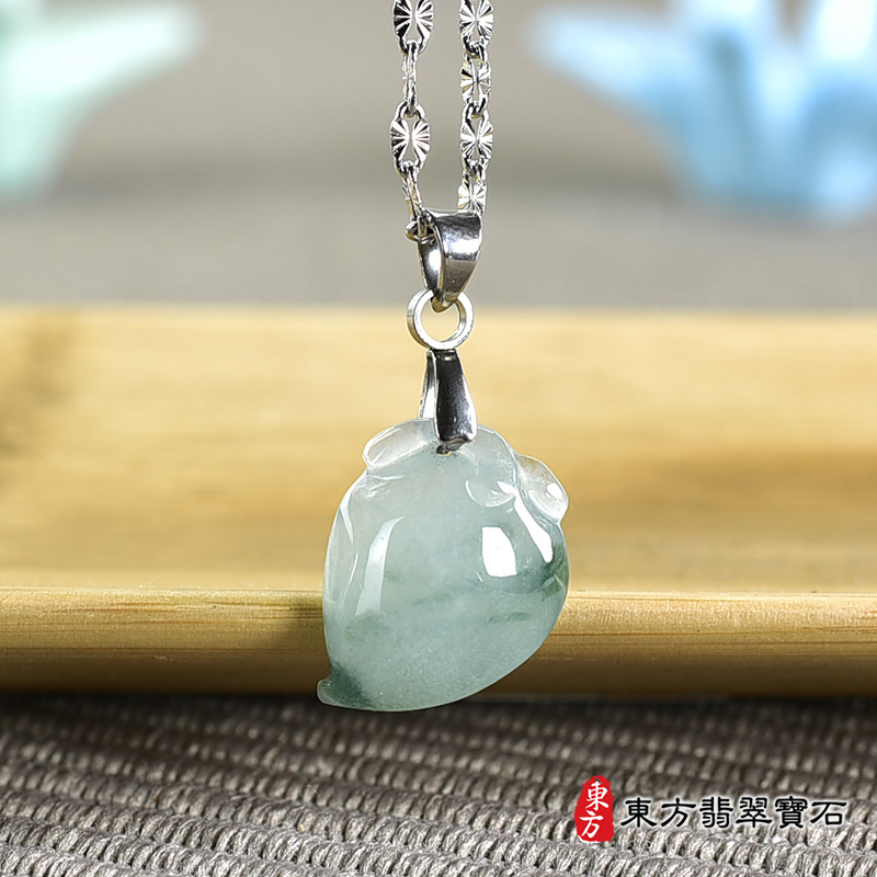 商品名稱:翡翠壽桃項鍊玉珮(福壽雙全:壽桃牌A貨翡翠壽桃玉珮、緬甸玉壽桃玉墜)。淺綠色帶飄花糯種壽桃,FW296。客製化訂做各種翡翠壽桃吊墜玉珮項鍊。★附A貨翡翠雙證書