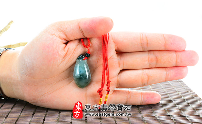 這一只玉墜是翡翠分級裡面,屬於「油青種」的種地。油青種為結構細膩,表面呈油脂光澤的翡翠種類。此款吊墜顏色有分明的漸層感,中間部份為深色,而深色沉穩大器,也具有正氣,握在手上有內斂和飽滿的力量。上下較淺的色澤透出玉瑩感,是只色調漂亮的玉墜。綠色翡翠在歷史上代表財富,是最純正的帶有安定力量的翡翠品種。