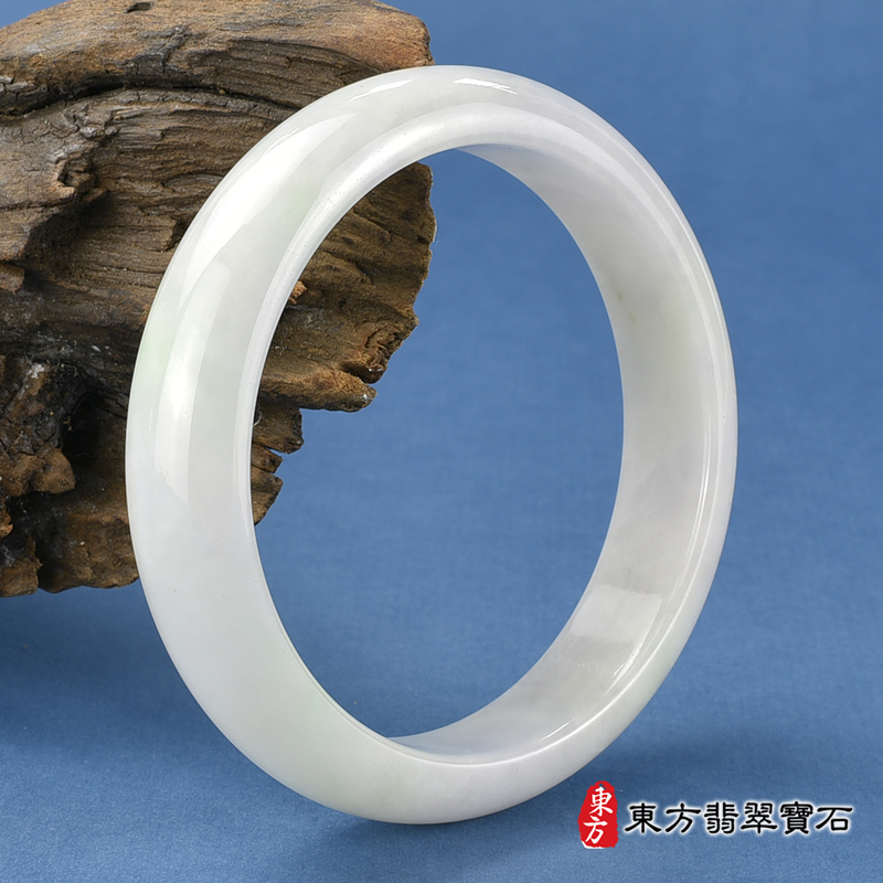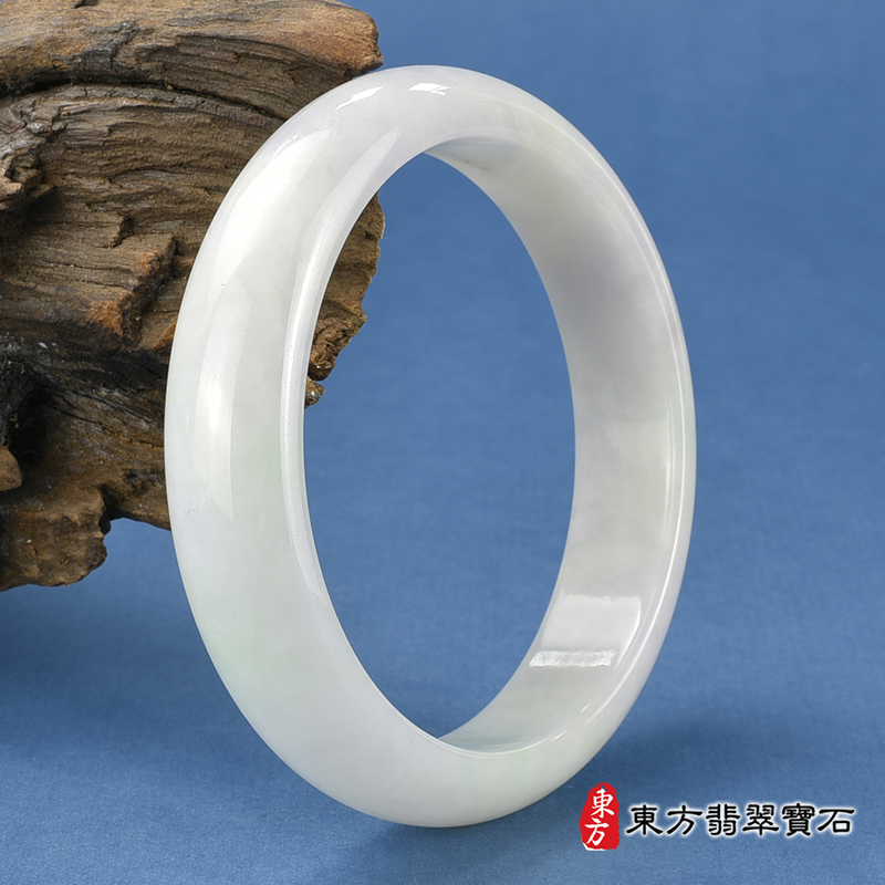 這一只手鐲是翡翠分級裡面,屬於「白底青」的種地。內裡有著大量的棉質化晶體,綿密細緻,玉鐲質感扎實,握在手中飽滿有力,質地呈現不透明或半透光。玉鐲色澤白綠分明,純潔的白色凸顯了綠的特徵。兩色交織,協調有致,為白底青翡翠的特色。白色翡翠在歷史上代表好運,是最具有吉祥兆頭的翡翠品種。