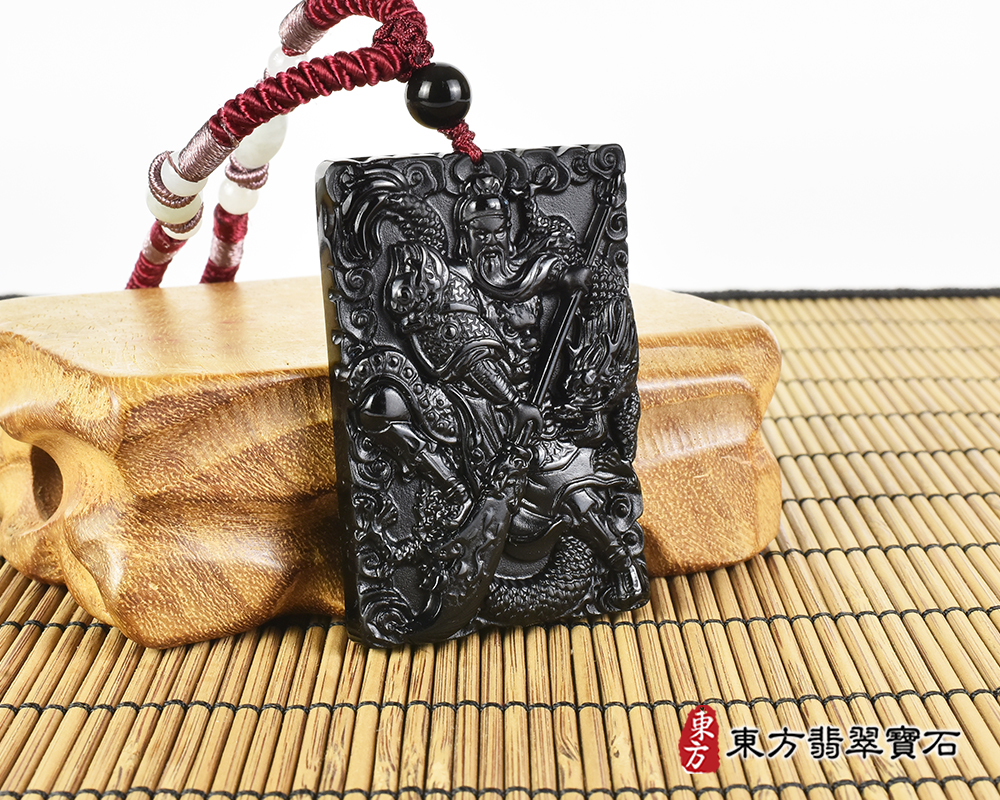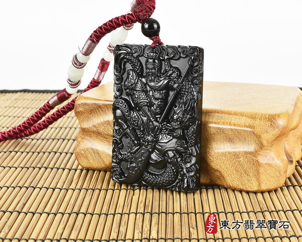 商品名稱:黑曜石關公項鍊玉珮(乘龍關聖帝君、乘龍關公:關公牌黑曜石關公玉珮、黑曜石關公玉墜)。全黑黑曜石關公,KG678。客製化訂做各種黑曜石關公吊墜玉珮項鍊。★附東方翡翠寶石保證卡