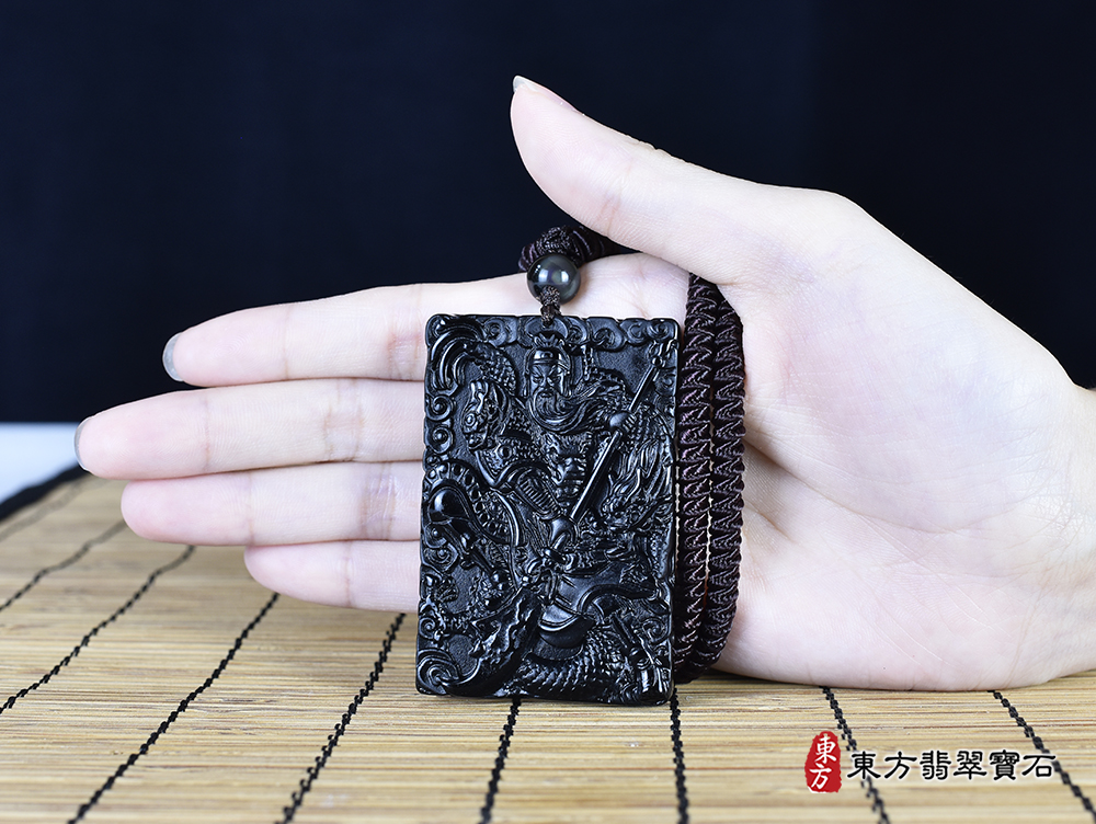 商品名稱:黑曜石關公項鍊玉珮(乘龍關聖帝君、乘龍關公:關公牌黑曜石關公玉珮、黑曜石關公玉墜)。全黑黑曜石關公,KG683。客製化訂做各種黑曜石關公吊墜玉珮項鍊。★附東方翡翠寶石保證卡