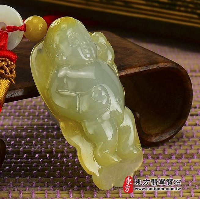 這一只吊墜是翡翠分級裡面,屬於「糯豆種」的種地,帶有「黃翡」的種地,內裡為細密的棉質化晶體,如濃稠的糯米湯一般,隱約朦朧,似夢似幻,玉墜的主體為淡綠色,淡綠的色澤相當飽滿,具有壯大的作用,使的小天使的身形更加圓潤,玉墜的色底為淡黃色,淡黃色明亮耐看,具有激勵人心的作用。表面有著油亮感,使雕刻的輪廓更為細緻、深刻,這個玉墜手感溫潤細膩,玉墜的質地扎實有份量,配合黃色邊緣的色澤,給人明快的感覺。綠色翡翠在歷史上代表財富,是最純正的帶有安定力量的翡翠品種。而黃翡在歷史上代表平安,黃色代表招財,是最具有富貴色彩的翡翠品種。
