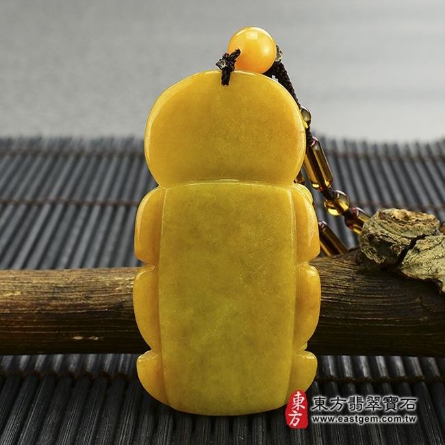 這一只吊墜是翡翠分級裡面,屬於「黃翡」的種地。它的顏色是硬玉晶體生成後,由鐵元素致色而形成。黃翡在歷史上代表平安,黃色代表招財,是具有富貴色彩的翡翠品種。