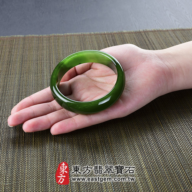 這一款手鐲是「俄羅斯碧玉」的材質,也有人稱做「和闐玉、碧玉、俄羅斯碧玉、加拿大碧玉或是台灣玉」這些指的都是同一種材質,學名為「閃玉、和闐玉」。在礦物學上,只有兩類礦物被稱做玉,一種是角閃石類的閃玉,就是這裡的「和闐碧玉」;另一種是輝石類的輝玉,像是緬甸的翡翠。