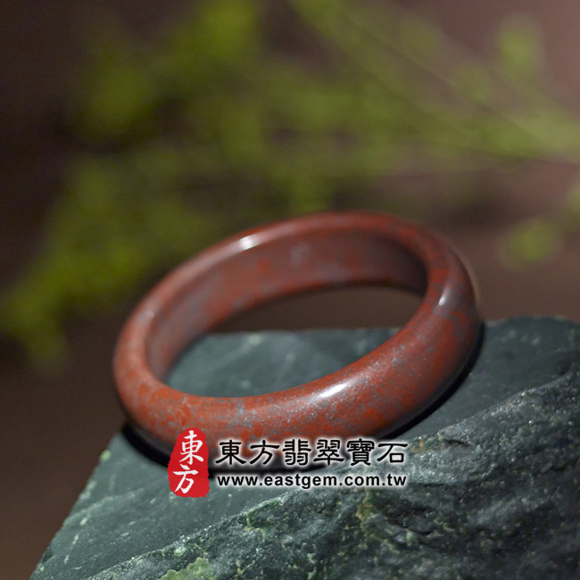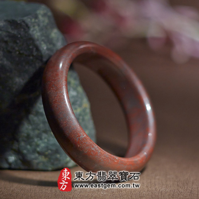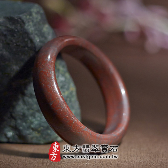 這一只手鐲是厚版的「紅礦雞血玉」(帶銅礦鐵礦)的材質。「紅礦雞血玉」是石英礦,硬度很高,大約在6.5至7度,其礦石的生長夾帶銅礦和鐵礦的礦物,重量上會比一般玉石手鐲來得更沉穩、重量更足。