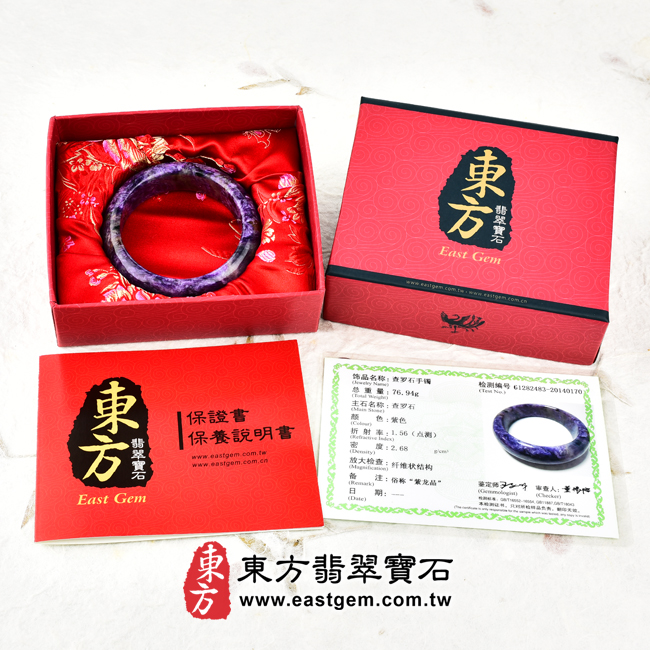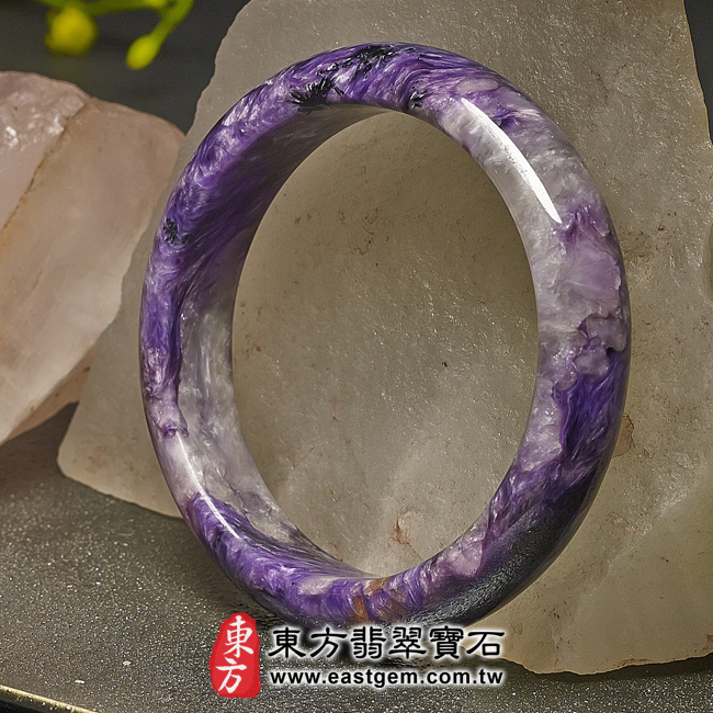 這一只手鐲是厚版的「紫龍晶」的材質。「紫龍晶」的學名叫「查羅石」,是一種罕見稀有的紫色寶石,是由含強鹼性的霞石正長岩,入侵到石灰岩中,透過特殊的壓力、溫度、化學成份、物理條件所形成。