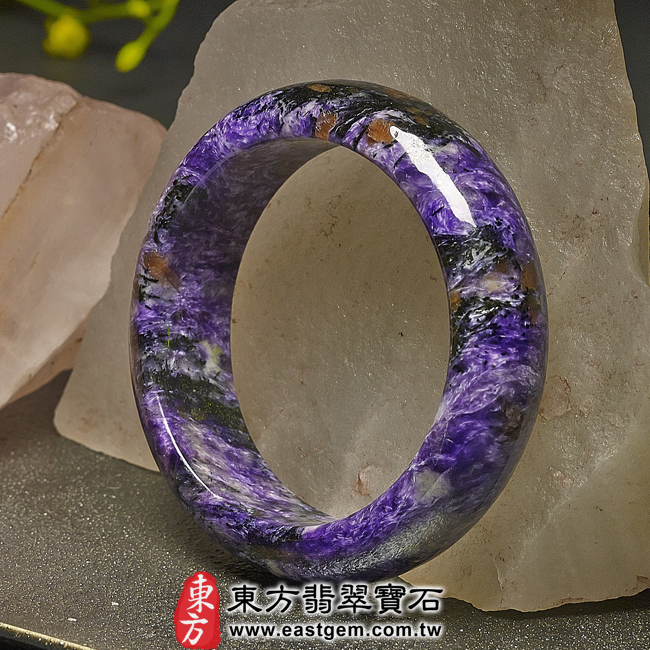 這一只手鐲是厚版的「紫龍晶」的材質。「紫龍晶」的學名叫「查羅石」,是一種罕見稀有的紫色寶石,是由含強鹼性的霞石正長岩,入侵到石灰岩中,透過特殊的壓力、溫度、化學成份、物理條件所形成。