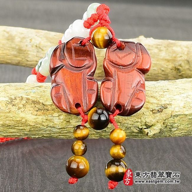 這一款吊墜是「紅虎眼石」的材質,紅虎眼石又稱為木變石、虎睛石,表面具有絹絲光澤,質地細膩,不透明,為南非的國寶石。虎眼石顧名思義,就像是森林之王老虎的眼睛一般,呈現出威風凜凜的氣勢。紅虎眼石象徵著強大而堅韌的生命力,相傳有著避邪招財之功效,能狗護佑人們身強體壯、招財進寶,紅色象徵著熱情與勇氣,配戴紅虎眼石吊墜,期許配戴者不管做任何事都能鼓起勇氣與自信,貫徹始終。
