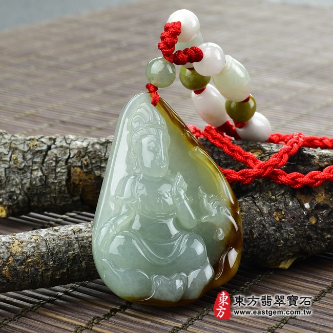 這一只吊墜是翡翠分級裡面,屬於「糯種」的種地。內部結構和細膩度,呈現一種隱隱約約之感,霧靄朦朧,似夢似幻。此玉墜手感手感溫和,觸感微涼,表面的油亮感加深了玉墜整體輪廓的力度,在燈光的照耀下,色彩繽紛的玉墜更加明亮活潑。玉墜的主體為淡雅淺綠色,光澤明亮,襯托菩薩出塵的氣質,邊緣為黃褐色與紅褐色相互交織,質樸的黃褐色有著一絲火紅流轉於其中,沉穩、大器,此外,紅色與黃色,代表著長壽與富貴,配戴這樣色澤的玉墜,吉祥富貴集於一身,圓滿無缺。