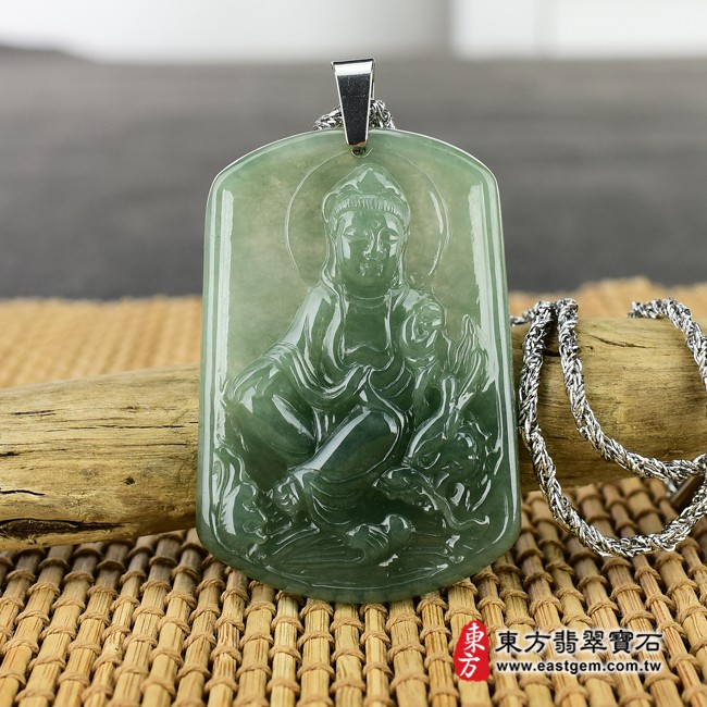 商品名稱:翡翠觀音項鍊玉珮(觀世音菩薩,乘龍觀音:觀音牌A貨翡翠觀音玉珮、緬甸玉觀音玉墜)。綠色糯冰種油青觀音,GY439。客製化訂做各種翡翠觀音吊墜玉珮項鍊。★附A貨翡翠雙證書