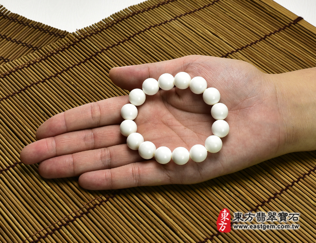 東方翡翠寶石的白硨磲手珠珠串皆採用天然硨磲、手工雕磨拋光,最正宗的硨磲就是全白的、表面雜質少、光滑圓潤,色度白不發黃、沒有坑坑漥窪的便是上品,在自然界中「白度」最高的便是白硨磲。此款白硨磲色澤潔白純淨,顆顆渾厚飽滿,質感圓潤大器、油亮有光澤感,佩帶白色手珠更顯得大方成熟。