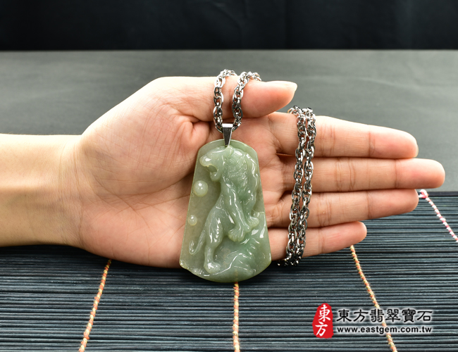 商品名稱:翡翠虎項鍊玉珮(虎虎生風:虎牌A貨翡翠虎玉珮、緬甸玉虎玉墜、虎十二生肖項鍊)。淡綠色糯種虎,TR074。客製化訂做各種翡翠虎吊墜玉珮項鍊。★附A貨翡翠雙證書