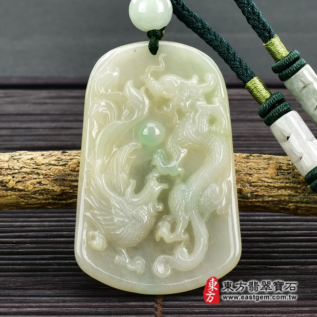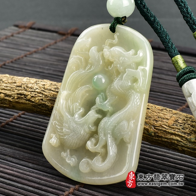 商品名稱:(已出售勿下標,可訂做)翡翠龍鳳項鍊玉珮(龍鳳呈祥:龍鳳牌A貨翡翠龍鳳玉珮、緬甸玉龍鳳玉墜)。淡綠色糯種帶飄花龍鳳,DR481。客製化訂做各種翡翠龍鳳吊墜玉珮項鍊。★附A貨翡翠雙證書